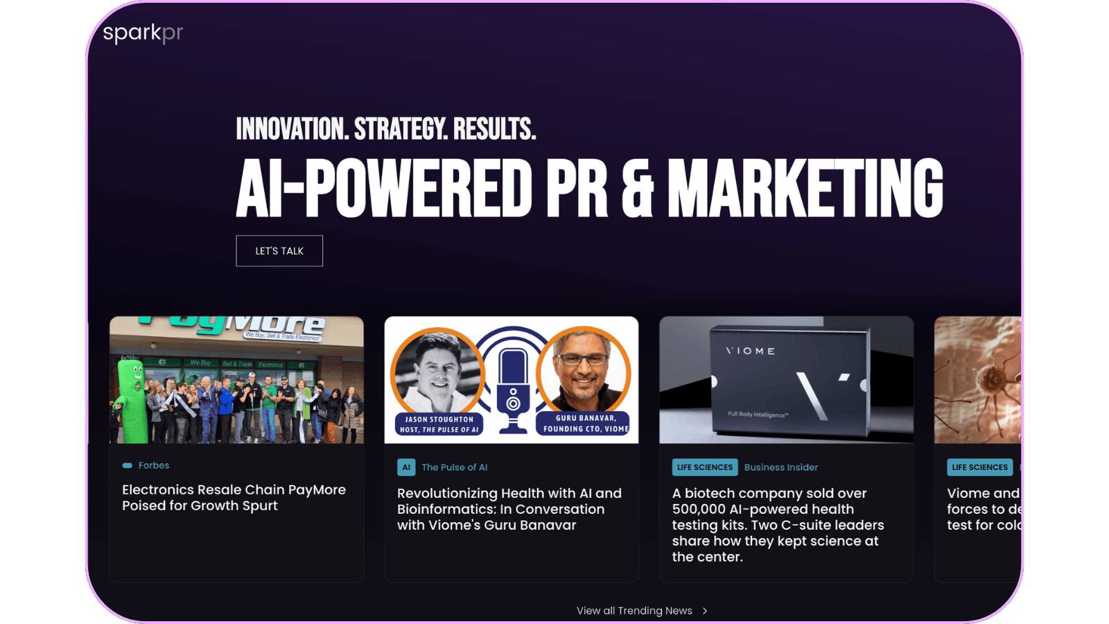What they’re great at: Spark PR pioneers AI‑powered PR, weaving media monitoring, personalization and predictive analytics into campaigns. They position AI clients as industry leaders by combining efficiency with creativity and leveraging automation for real‑time insight.